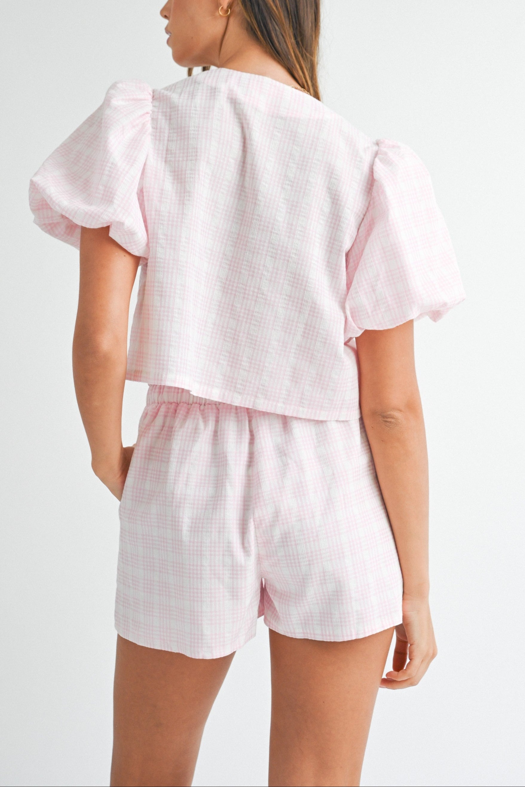 This pink gingham set features a playful bow tie detail on the front of the shirt, adding a charming touch to your look. Perfect for dressing up or keeping it casual, the matching shorts complete an effortlessly cute outfit for any occasion.