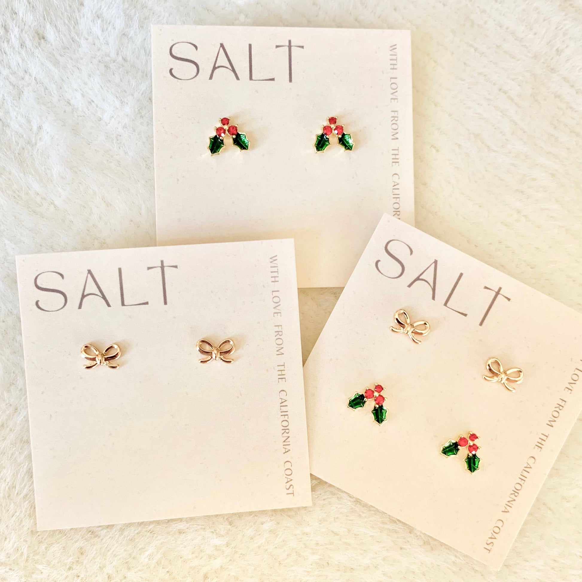 HAPPY HOLLY-DAYS! This festive stud duo is the perfect holiday cocktail of festive and chic. A sweet ear stack for the holiday season. Of course, the cutie bow earrings can be worn year-round! SAFE FOR SENSITIVE SKIN