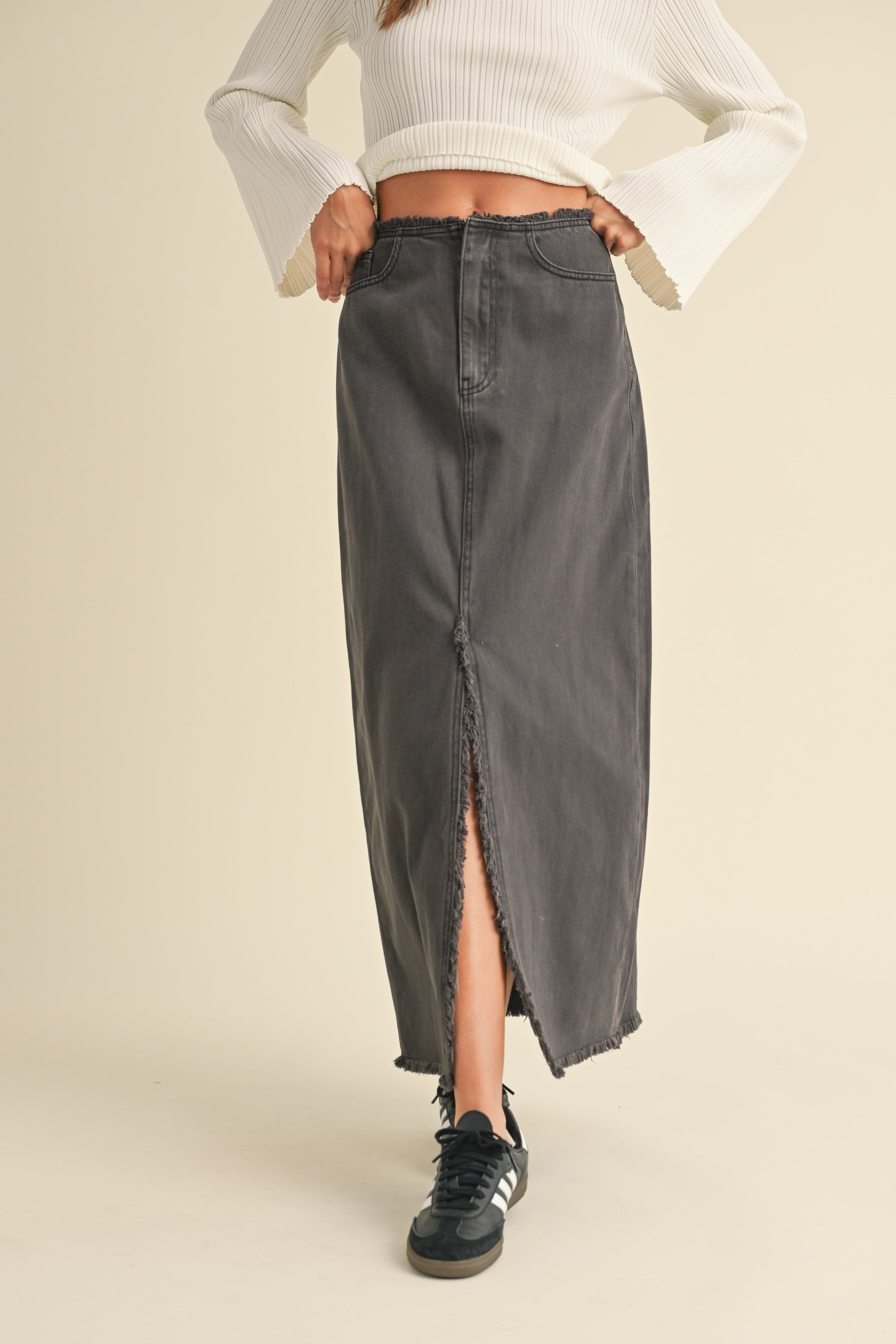 Elevate your wardrobe with our bold charcoal denim maxi skirt! The playful frey edge detail on both top and bottom adds just the right amount of edge to this versatile piece. Rock it with sneakers for casual coffee dates or dress it up with heels for night adventures. Your new favorite go-anywhere skirt awaits!