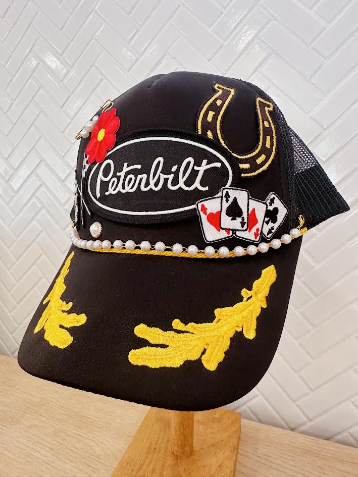 Peterbilt Custom Trucker Hat, featuring a fabulous pearl hat chain detail that adds a touch of Wildflower flair to your trucking adventures! Perfect for standing out at truck stops or adding some sparkle to your daily drive. Who says you can't haul with style?