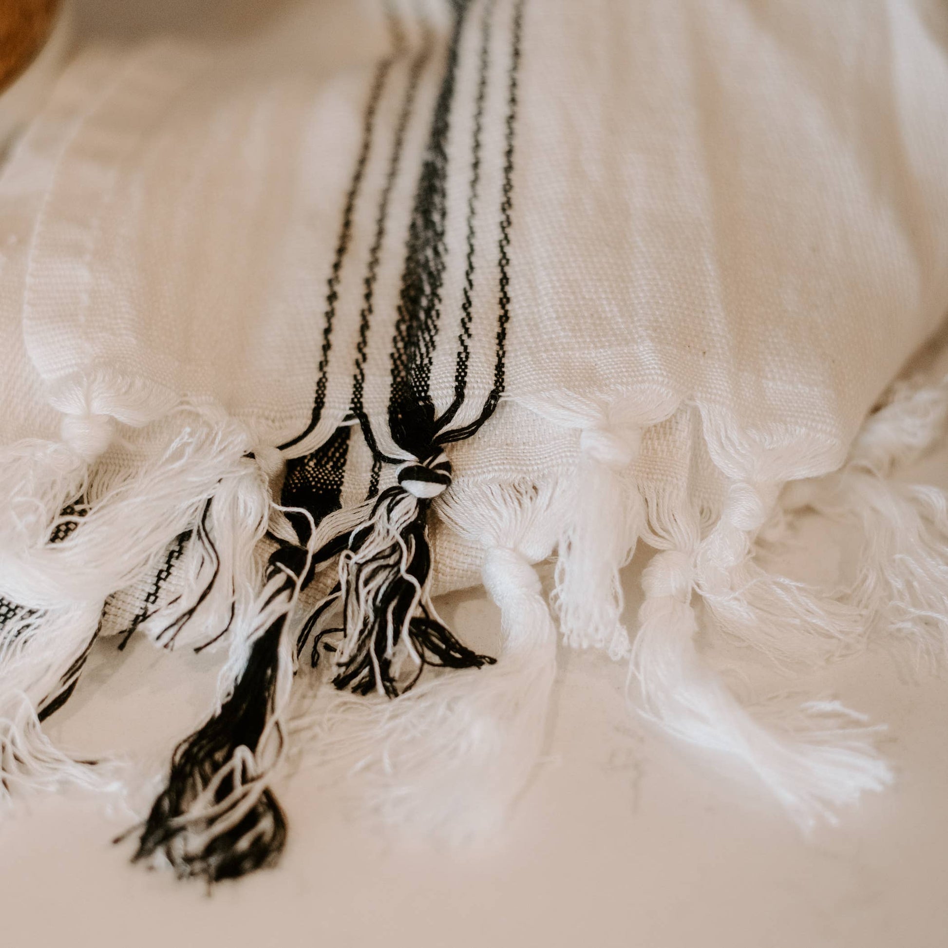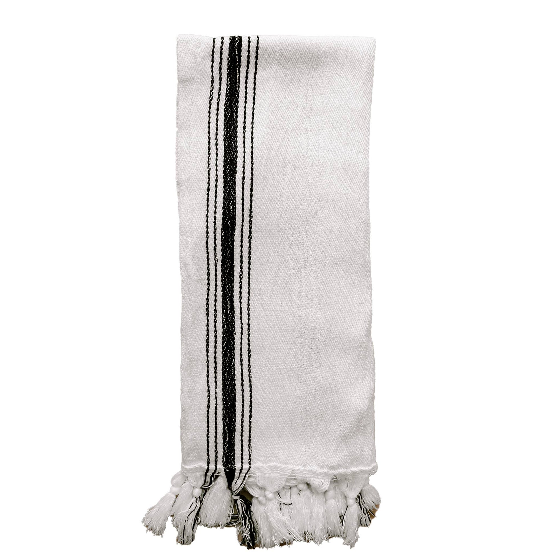 Our generously oversized, super soft, Turkish Cotton + Bamboo Towels are ideal for use as hand towels, kitchen towels, bath, or hair towels, toddler/baby towels, and more. This quick drying towel will become softer and more absorbent with each wash. Each towel is unique and my vary slightly in size, color, and weight. DETAILS: • Size: Approximately 19 x 35" • Color: Natural with Black + Tan Stripes (may appear cooler or warmer in color depending on light) • Hand Woven on Wooden Loom • 100% Turkish Cotton • Made in Turkey • Style No. HT006 CARE: • Machine Wash Cold + Tumble Dry Low Heat • Do Not Use Hot Iron, Fabric Softener, or Bleach • Do Not Dry Clean